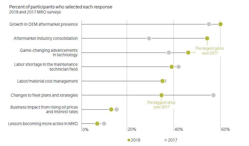 While last year’s survey participants were equally preoccupied by the rapid expansion of the global airline fleet, this year OEMs were respondents’ number one disruptor (60%), followed closely by aftermarket industry consolidation (55%) – which in part is a result of heightened competition from OEMs. That category moved up 26 percentage points from last year – the most of any. Another category on the move is the impact of game-changing technology – up nine percentage points; fleet expansion dropped 22 percentage points to sixth place.