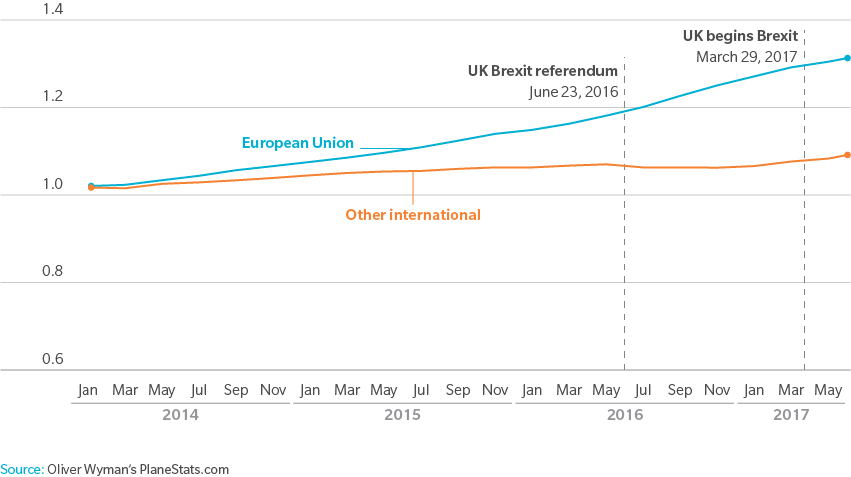 Brexit – the departure of the United Kingdom from the European Union – is expected to impact many aspects of trade and travel. Oliver Wyman’s Planestats.com has been tracking data on capacity and passengers to see what has been happening to airline travel from the UK to the EU since the marriage-ending vote. Data for the first year post-referendum shows an uptick in both UK to EU capacity and passengers – and these figures have risen faster than for UK to non-EU destinations.