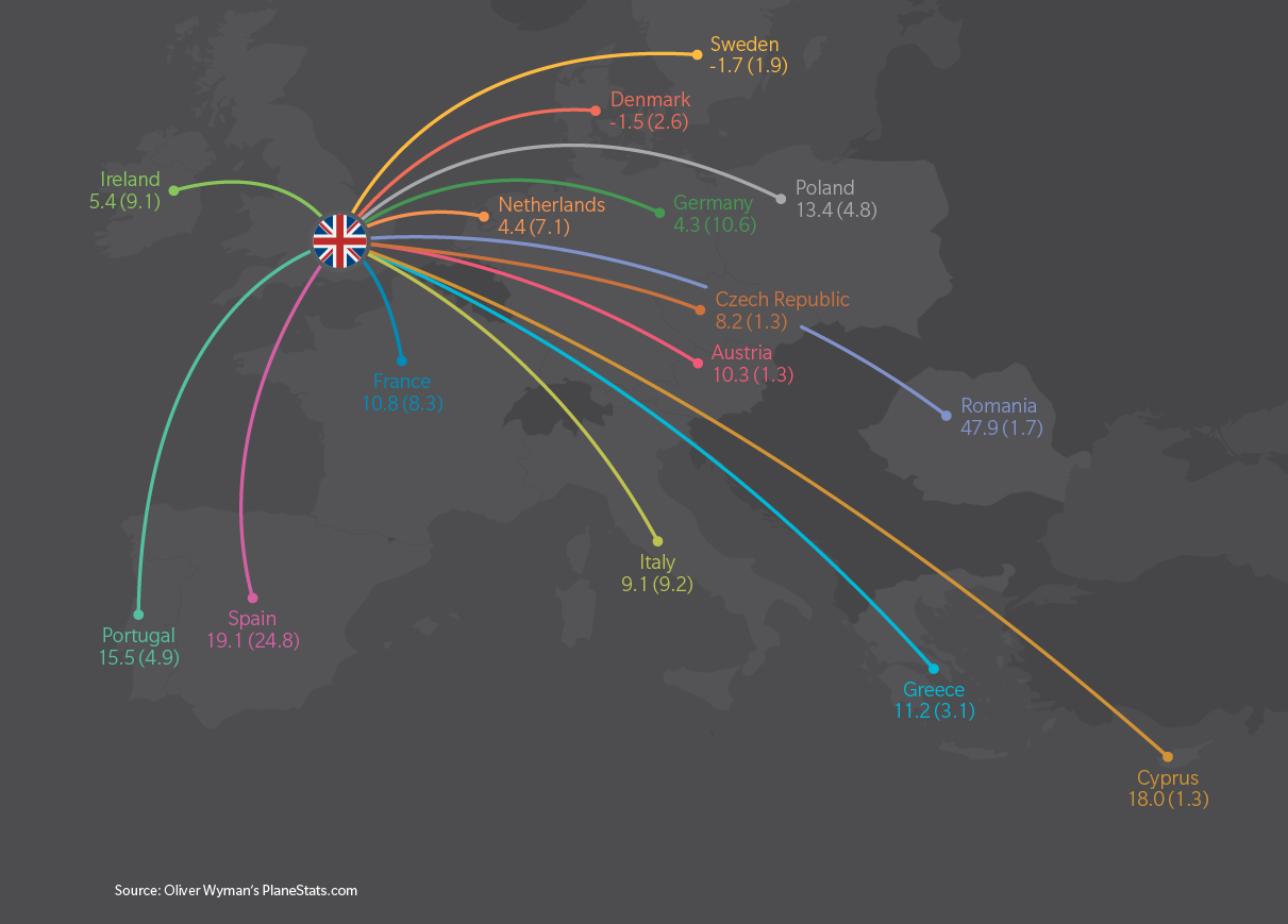 UK airlines also have seen a boost in passenger numbers on these routes. According to the UK’s Civil Aviation Authority, UK to EU passenger volumes have increased by 8.7 percent since the referendum, compared to a 6.8 percent rise in UK to non-EU destinations, possibly due in part to a decline in the pound after the referendum.
