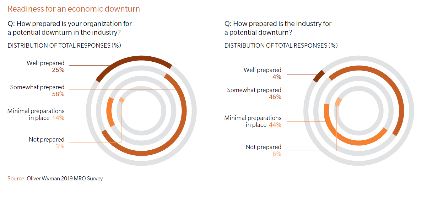 A decade of uninterrupted industry growth and some developing global headwinds raise concerns about whether an economic contraction is on the horizon. Our Global Fleet & MRO Forecast for 2019-2029, however, projects a strong ten years ahead with minimal downside due to the longtail regulatory required maintenance protocols for aircraft. Meanwhile surveyed market participants are also optimistic despite rising geopolitical and possible trade upheavals, rising interest rates, and fluctuating fuel prices. Even if the global economy slows, three-quarters of survey respondents believe their organizations are ready to ride out rough weather, yet were less bullish on the preparations across the broader aviation industry. This disconnect may suggest that there is an opportunity for more formal planning and preparation for the inevitable downturn in a traditionally cyclical industry.