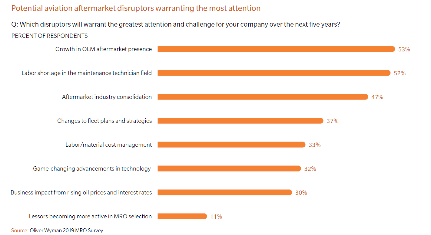 We also ask industry participants every year about potential top market disruptors, and once again OEM expansion topped the list, with airframe OEMs expected to utilize all available channels to push further into the MRO market. At the same time, airlines are concerned that they have balanced and competitive options for MRO, which may lead them to develop new suppliers or redevelop some of their own technical capabilities to counter the OEM surge. Some signs of airlines further investing in their captive MRO services or bringing work back in house are popping up.